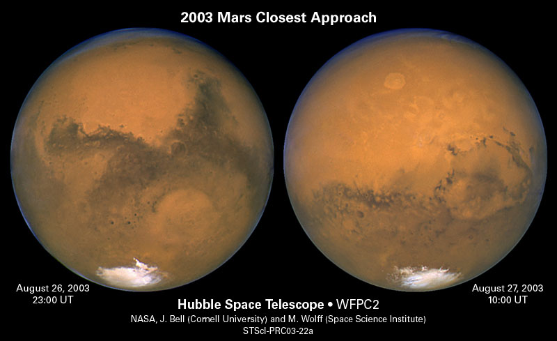 August 27, 2003: These two images, taken 11 hours apart with NASA's Hubble Space Telescope, reveal two nearly opposite sides of Mars. Hubble snapped these photos as the red planet was making its closest approach to Earth in almost 60,000 years. Mars completed nearly one half a rotation between the two observations.
