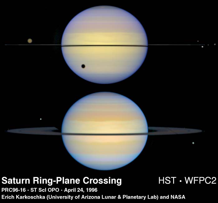 April 24, 1996: The Hubble telescope has captured snapshots of Saturn with its rings nearly edge-on to our view.